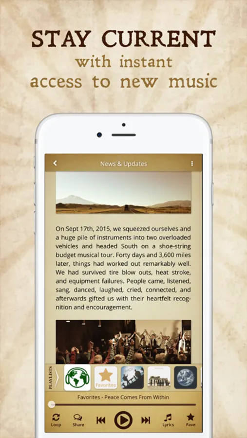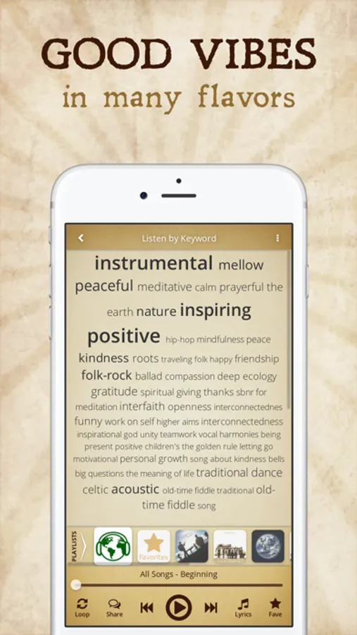 With everything from folk ballads and old-time Celtic tunes, to roots-rock and hip-hop, to meditative synth soundscapes — use this feature rich custom built music app to enjoy free access to the uniquely positive and meaningful music of the Sunship Awakeneers .