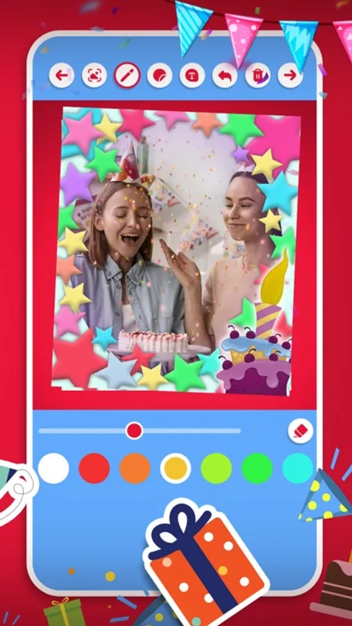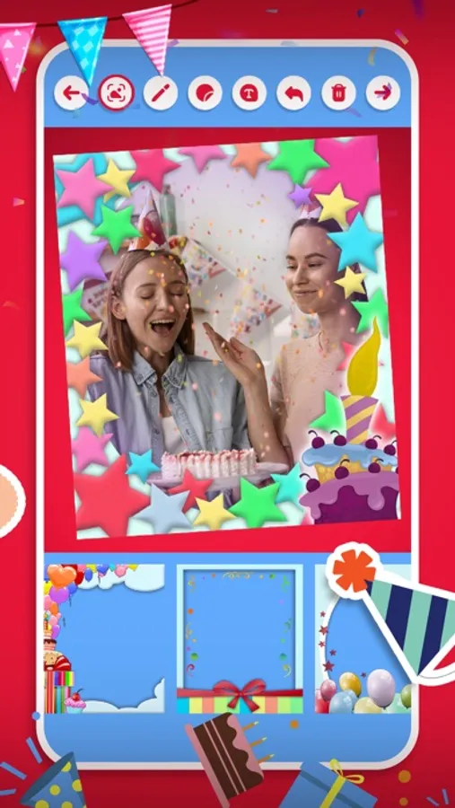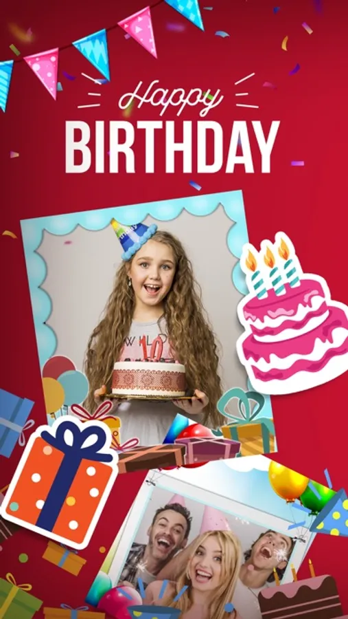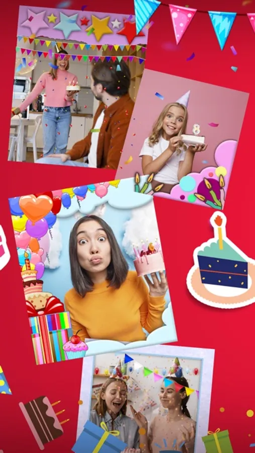 • Funny birthday cards with a celebration decoration: candles, confetti,birthday cake, gifts, balloons, presents and cupcakes.