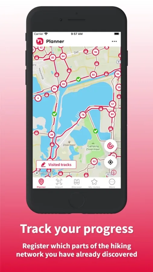 For every route between two hiking nodes, you can indicate whether you have already walked it. This is visually displayed on the map so you always have an overview of where you have already walked. In navigation mode, the app automatically registers which routes of the hiking network you walk. This way, you can always plan the most beautiful routes along paths you have never been before.