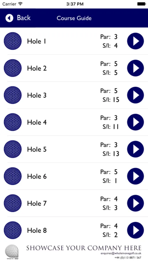 The app features the Whole in One Golf GPS Range Finder and Digital Guide to playing the clubs 18 hole golf course. The App works as an virtual aid, giving you a 3D Flyover of each hole, a pin positioning system.