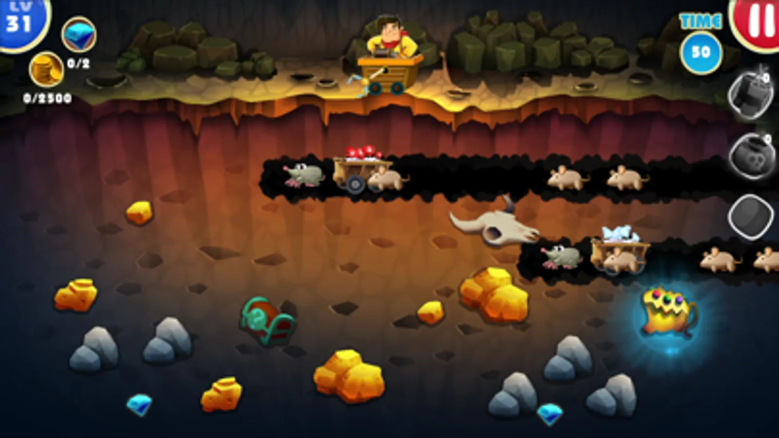 - Obstacles items: monster mouse, dynamite, stones, bones are difficult obstacles that you need to avoid.