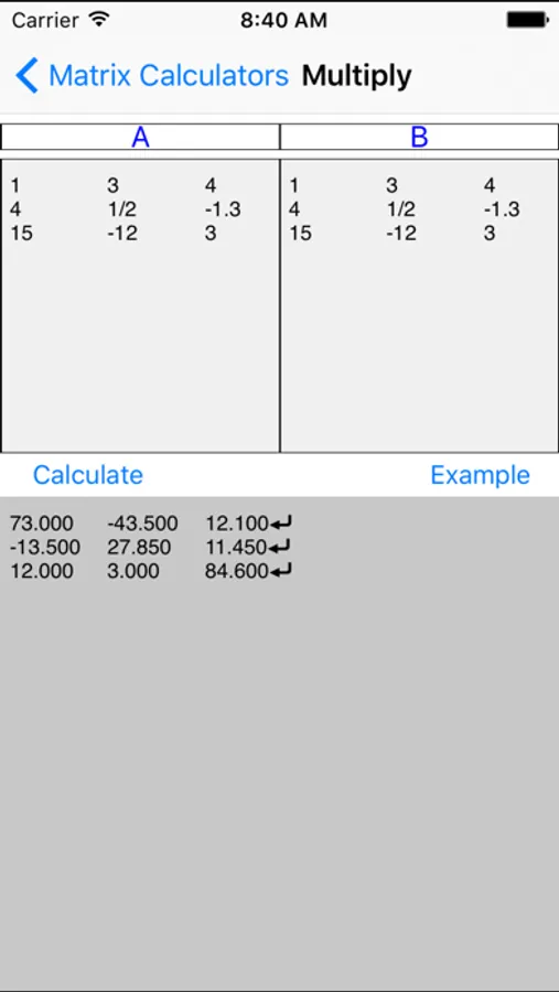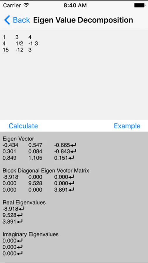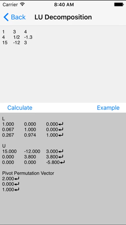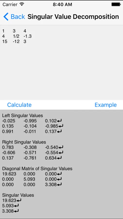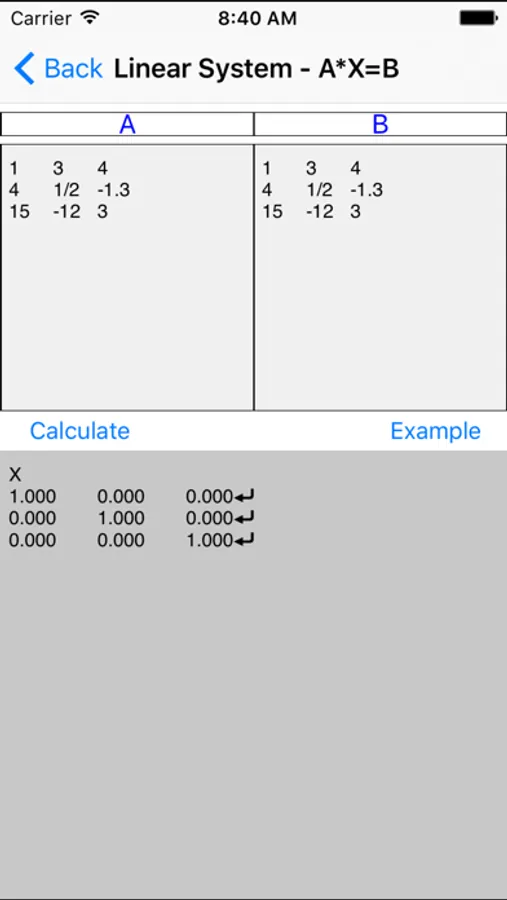 This app contains several matrix calculators for matrices of any size. Results can be displayed in decimal format or fractional format.