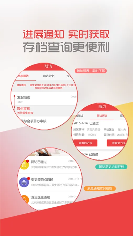 中慈助医应用以中华慈善总会多吉美慈善援助项目的业务流程出发,按照患者、医生两套独立使用场景,借助人性化的“一键式”操作界面,直观、简洁地呈现项目流程中的各项操作环节,通过移动互联技术,实现病理报告、医学资料及小视频影像上传,让入组患者与注册医生之间轻松实现远程医学随访,有效减少了传统大病随访为患者及家属带来的种种不便,以高效的随访效率,让患者更为便捷地领取到免费援助药品,有效改善我国大病肿瘤领域患者“随访难、领药难”的现状。