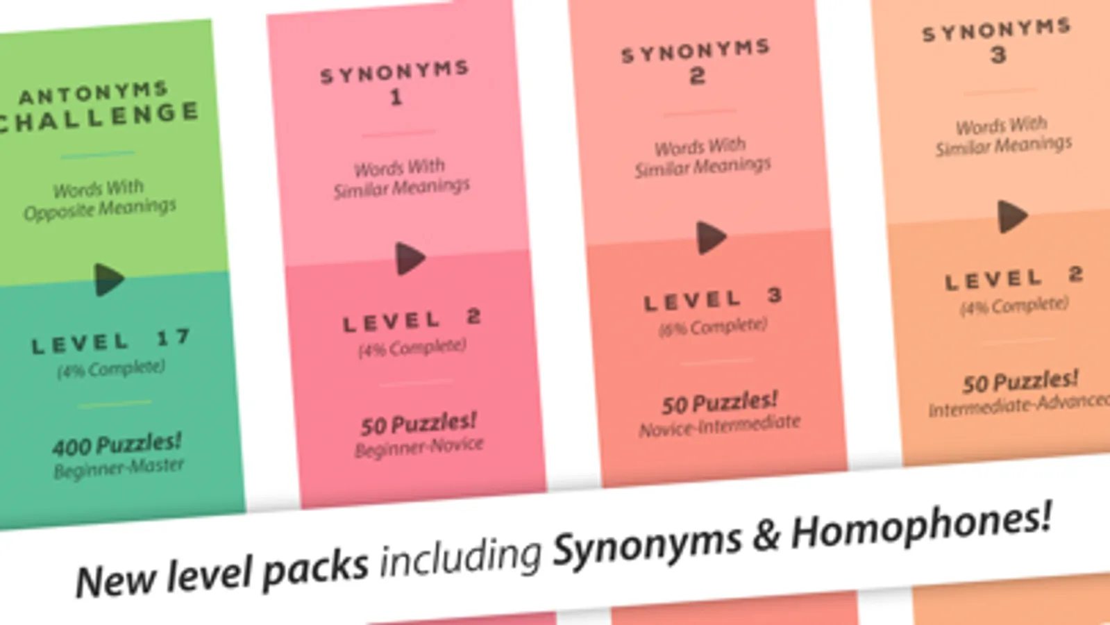 - Synonym & Homophone level packs with 400 additional levels