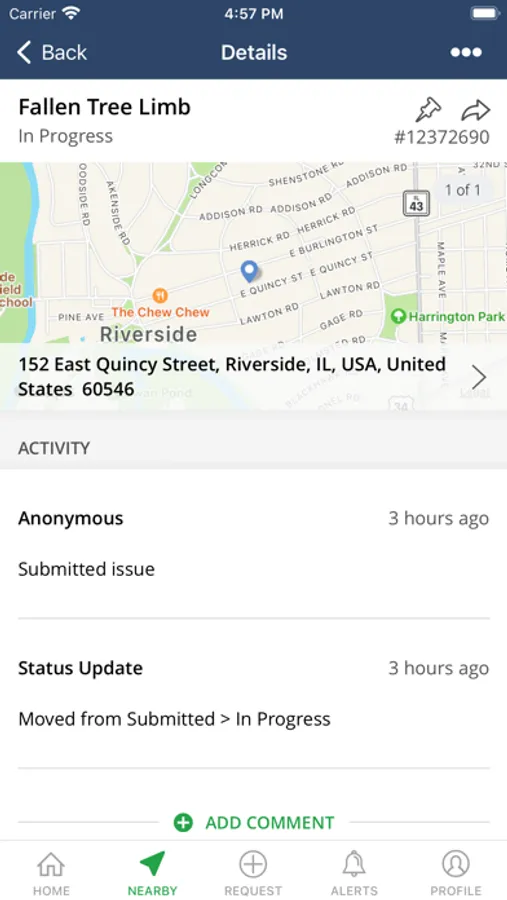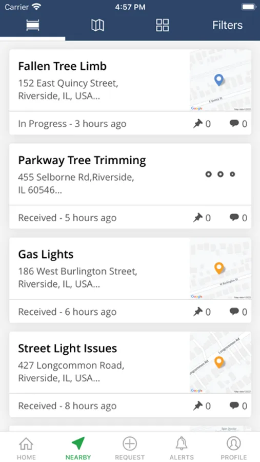 Use this application for direct access to Riverside, IL departments. Users may notify departments of any non-emergency issues, receive status updates on a reported issue, view other citizen requests, and be informed of village services.