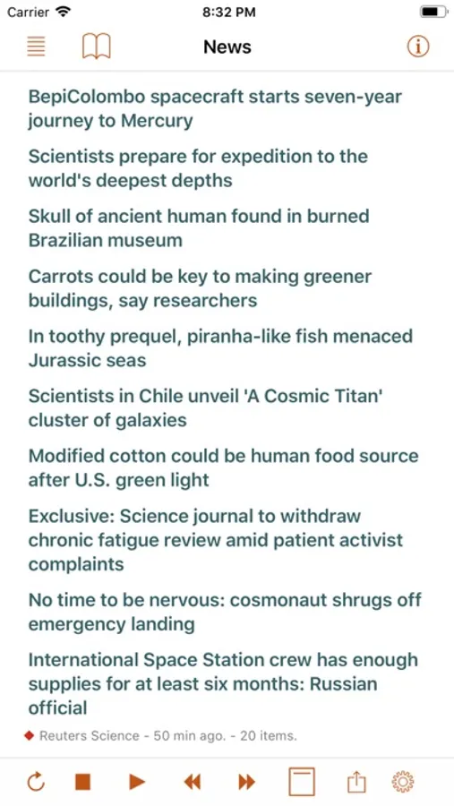 • Settings includes many controls for news story display, auto-reload, speech and auto-scrolling behavior, and user-interface sounds.