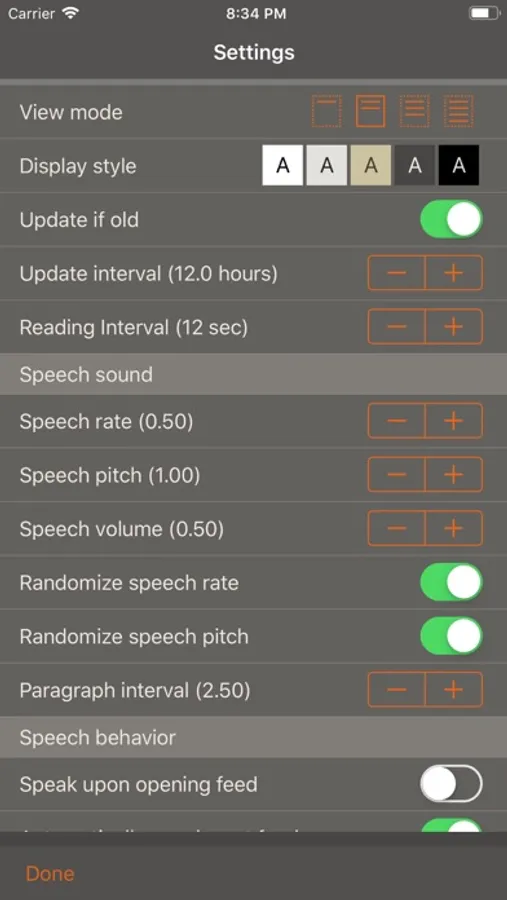 Use the Settings view to configure the text display, graphic style and behavior of Speak News.