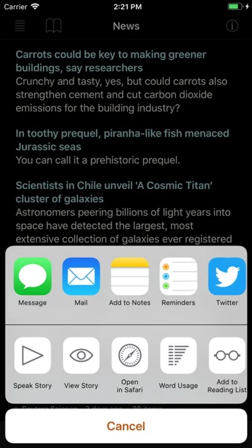 • Share news headlines and links, or entire news feeds through the standard iOS Share social media activities view, including Message, Mail, Notes, Reminders, Twitter, Google+, Flipboard, Facebook, Evernote, etc.