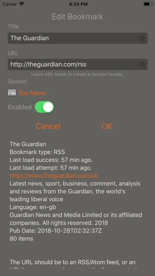 • RSS feed details are viewable in the Edit Bookmark view.