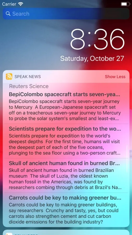 • Today Widget displays scrolling list of stories from current feed.