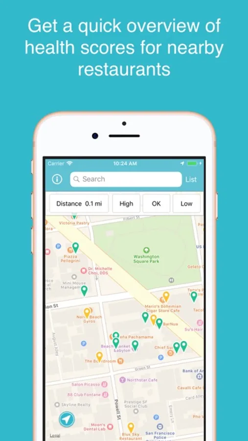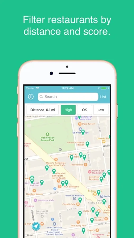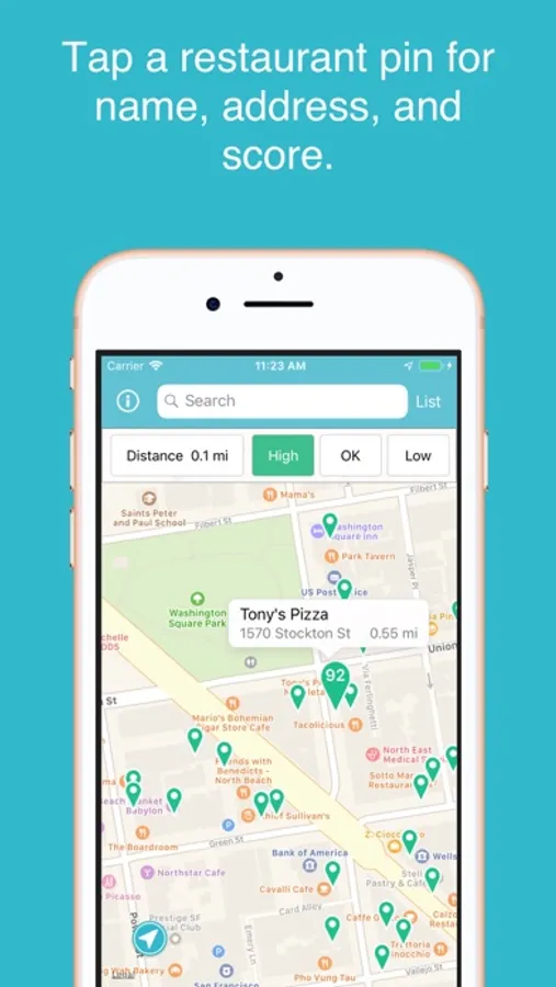 Lookup restaurant health inspection scores based on the restaurant's name or by location using the map.