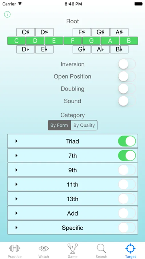 • Allow to customize the learning by chords' roots, forms, quality, inversion, and voicing (open or closed position, doubling)