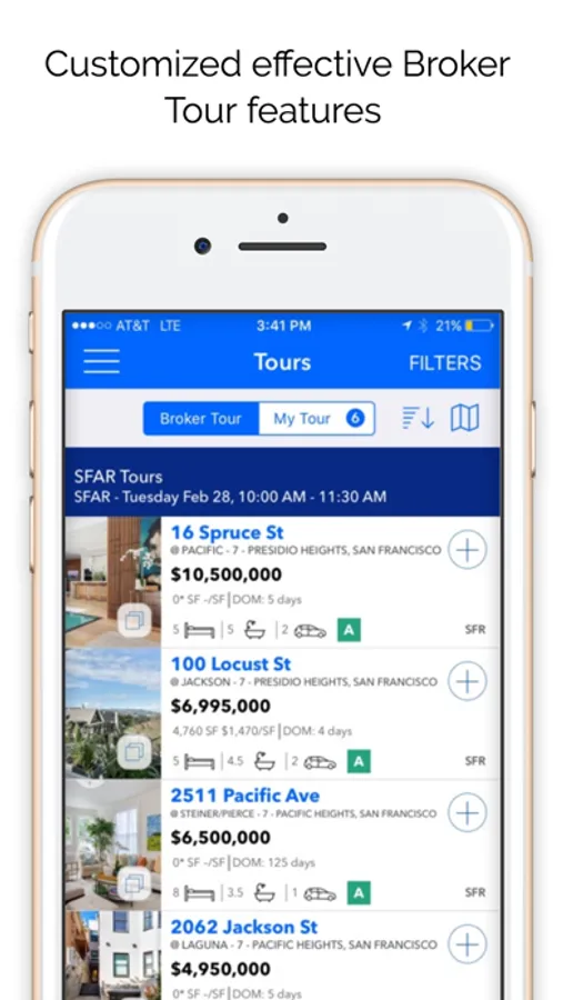 - Tour: Broker Tour details and a customizable “My Tour”, viewable on a List and Map