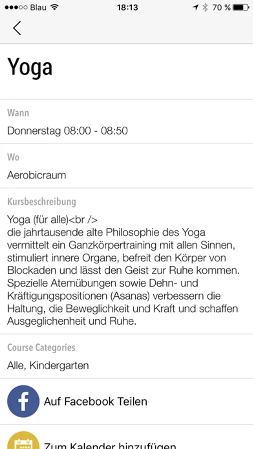 Direkter und aktueller Zugriff auf den Kursplan von überall: Für jeden Kurs kannst Du Details wie Zeit, Kursbeschreibung, Raum und Merkmale wie z.B. den Schwierigkeitsgrad einsehen.