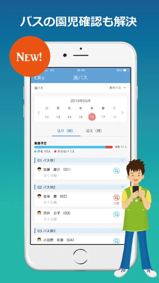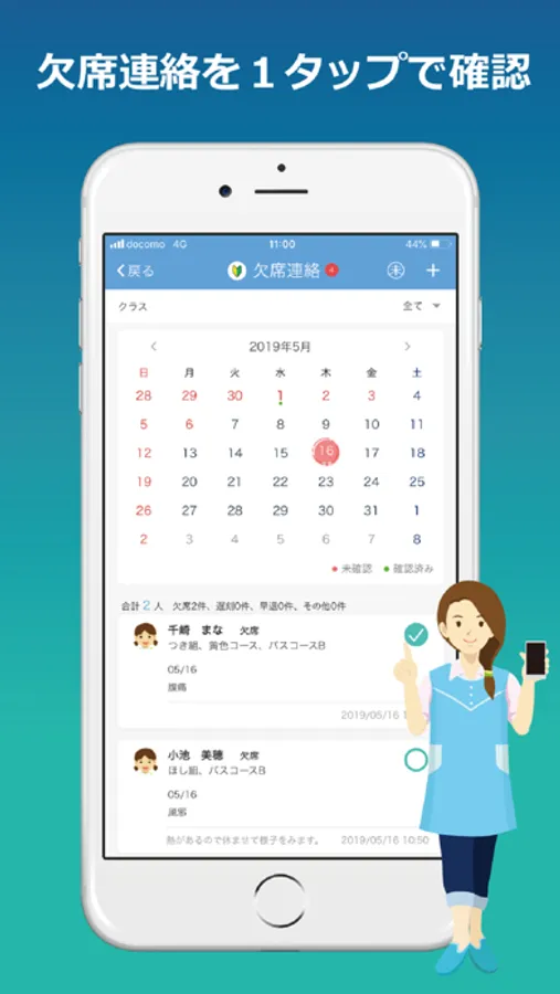 2.保護者用アプリと連携して、園からの「お知らせ」を日常も緊急時も効率よく、確実に届けます。また、保護者からの「欠席連絡」や「メッセージ」がいつでも、どこでも確認できます。