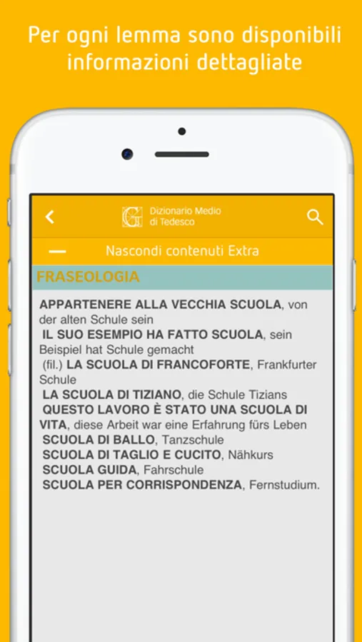 Il Dizionario Medio di Tedesco offre molto di più che una semplice ricerca: neologismi, accezioni, termini tecnici, falsche Freunde (false analogie tra italiano e tedesco), tavole di coniugazione dei verbi e note per risolvere i dubbi linguistici più comuni sono sempre a portata di mano, facili da raggiungere e da utilizzare. E per risparmiare tempo puoi memorizzare le tue ricerche nella cronologia per riutilizzarle ogni volta che vuoi, da qualunque dispositivo tu acceda alla app.