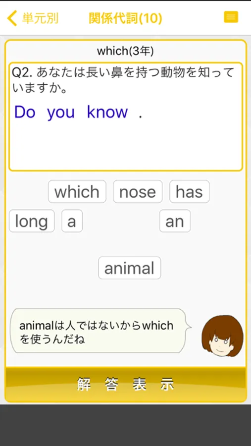 問題は「並べ替え」タイプになります。与えられた日本語文に従って単語を並べます。解答時、必要に応じてヒントや要点解説を見ることができるので、レベルにあわせた学習が可能です。