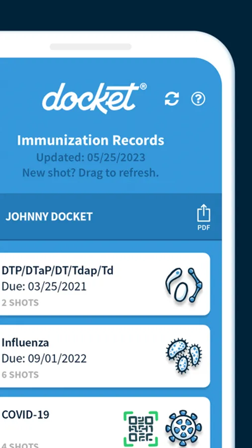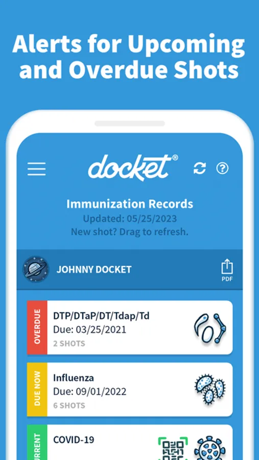 Docket® partners with public health heroes to make it easier than ever for you to access personal and family immunization records directly from Alaska Department of Health, Idaho Department of Health and Welfare, Minnesota Department of Health, New Jersey Department of Health, Utah Department of Health and Human Services, and Wyoming Department of Health. Track upcoming shots, review past immunizations, and share your official immunization reports.