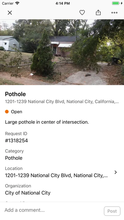 Submit a service request to the City of National City! For potholes, graffiti, street lights out, trees, sidewalks and more, the National City Connect app makes reporting an issue easier than ever. This app uses GPS to recognize you location and gives you a menu of common service requests to select from. The app allows youto upload pictures or video to accompany your request. The mobile app can also be used to submit many types of requests including street light issues, damaged trees, parking issues, graffiti, illegal dumping and much more. Residents can track the status of reports they or other members of the community have submitted and follow the issue from the time it is reported until it is resolved.