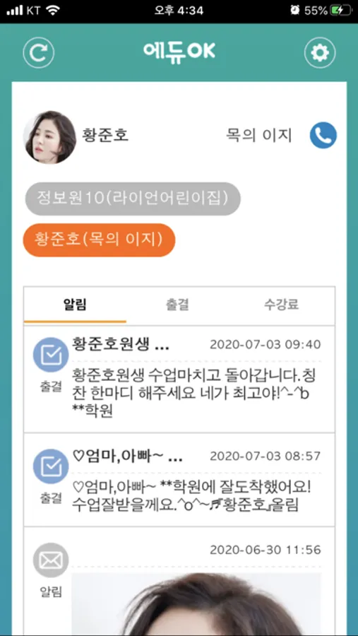 - 학부모앱으로 자녀의 출결사항, 학원알림, 수강료결제 내역을 확인할 수 있습니다.