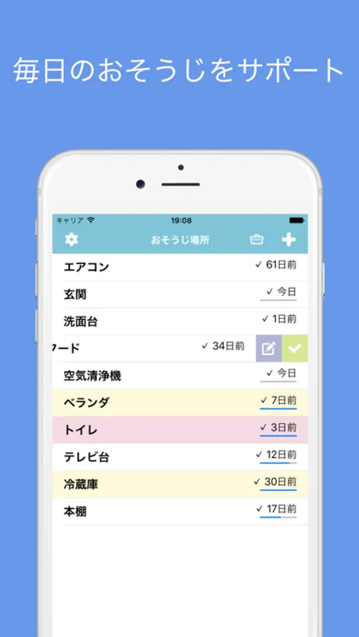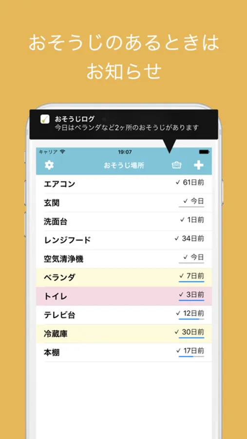 "+" ボタンからおそうじする場所と周期を登録して、