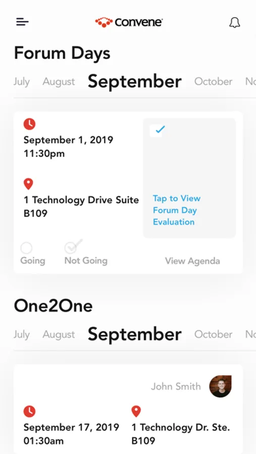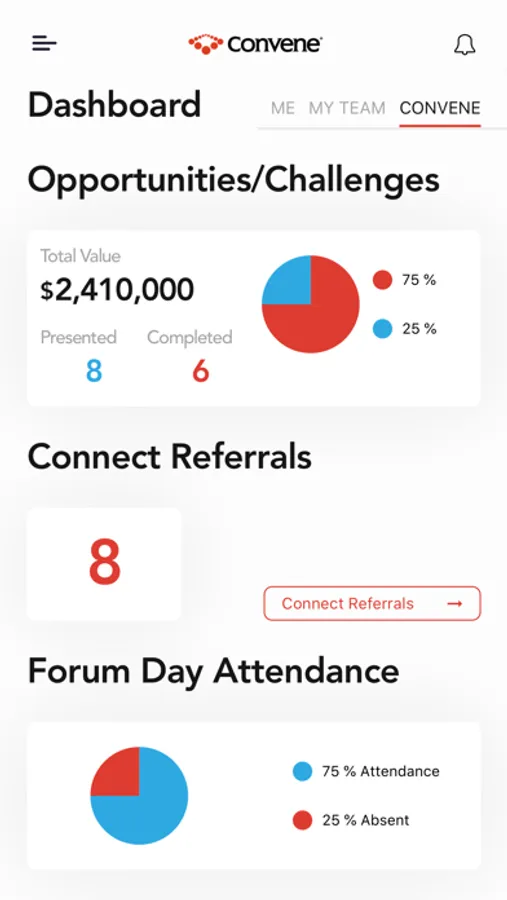 The Convene app allows Convene Members and Chairs to track metrics like meeting attendance, completion of opportunities/challenges, Forum Team feedback, and the overall value obtained from Convene. It also creates a space for a member to member communication both within teams and across all Convene members by industry. The Convene app is an integral tool that Convene Chairs will use to track value provided by their services, as well as growth and achievements on the part of their members.