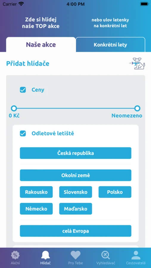 Můžeš si také nastavit sledování letenek na konkrétní datum do požadované destinace. My tě pak budeme průběžně informovat o jakékoliv změně ceny.