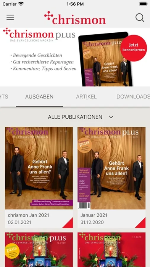 Die chrismon App bietet optimalen Lesekomfort auch im offline-Modus durch die Downloadmöglichkeit. chrismon digital lesen Sie im e-Paper-Format mit Lesezeichen- und Downloadmöglichkeiten. chrismon plus digital bietet zusätzlich folgende Funktionen an: