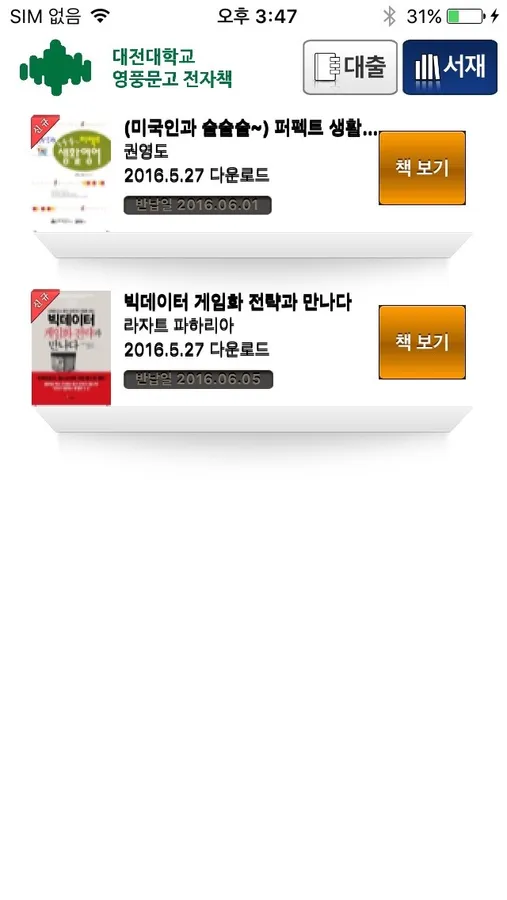 대전대학교 영풍문고 전자책 대출회원으로 인증한 이용자를 대상으로 전자책 서비스를 제공합니다. 전자책을 검색, 대출하여 스마트폰을 통하여 언제 어디서든지 책읽기가 가능합니다.