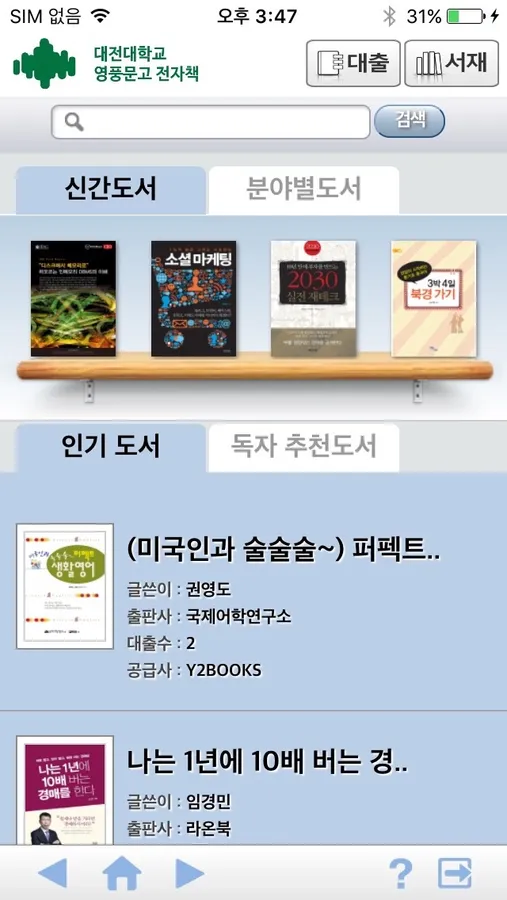 대전대학교 영풍문고 전자책의 도서이용 서비스를 스마트 폰에서 손쉽게 사용할 수 있도록 구성하였습니다. 도서의 검색에서 시작하여 도서 대출현황, 예약, 신청 등 도서관에서 이용할 수 있는 기능을 대전대학교 영풍문고 전자책 홈페이지를 접속하지 않더라도 스마트폰을 통하여 언제 어디서든지 이용할 수 있습니다