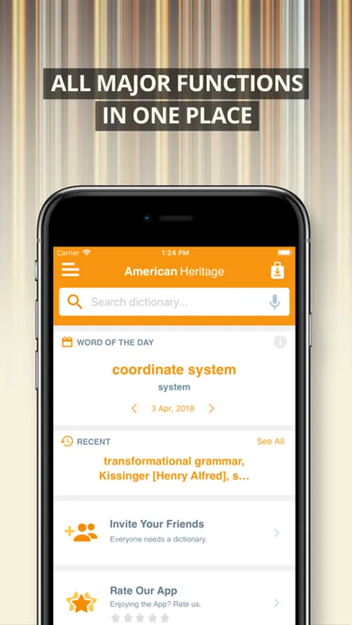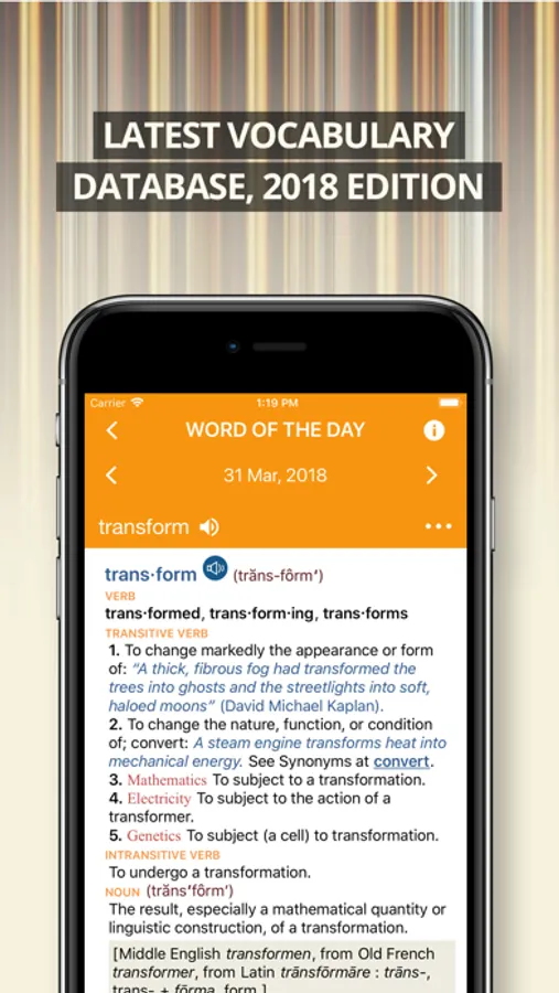 The AMERICAN HERITAGE ENGLISH DICTIONARY is one of the most comprehensive and accessible resources available on any mobile device. This is the perfect solution to use at school, in the office, or at home!