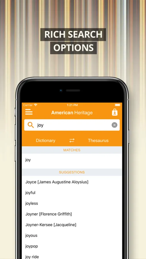 THE AMERICAN HERITAGE® ROGET'S THESAURUS (*available as an In-App Purchase) offers an intelligent and sensible guide to synonym selection. It provides a wide range of synonyms, ranging from mainstream vocabulary to the colorful alternatives that make English such a rich and versatile language. Thousands of slang, informal, and regional words broaden the coverage even further. Each synonym list focuses on a clear definition that quickly guides the user to the relevant meaning.