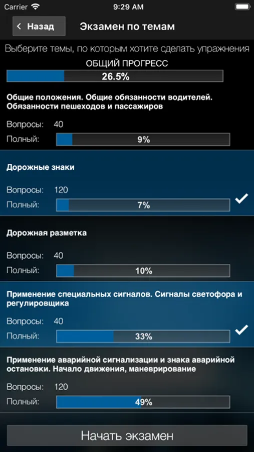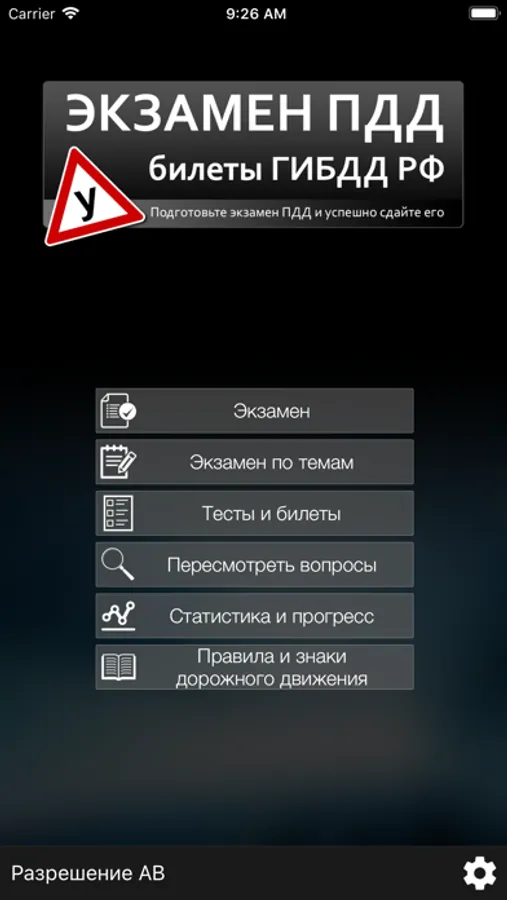 - Различные типы обучения (Симуляция экзамена, Экзамен по темам и Тест для получения водительских прав).