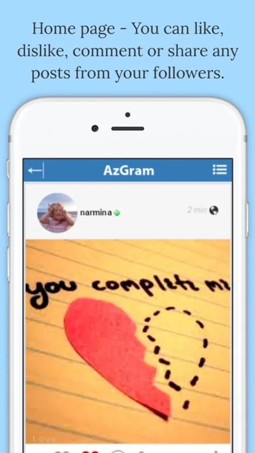 • Send private messages, statuses, photos, videos and posts from your feed directly to friends with AzGram Message.