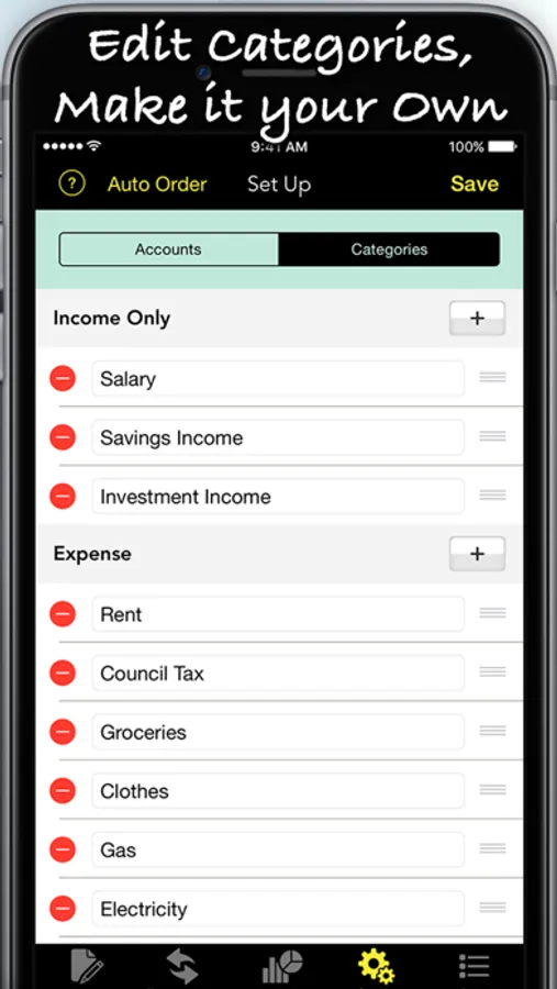 √ Record Income & Expenditure under user defined Categories - Groceries, Fuel, Clothes, etc
