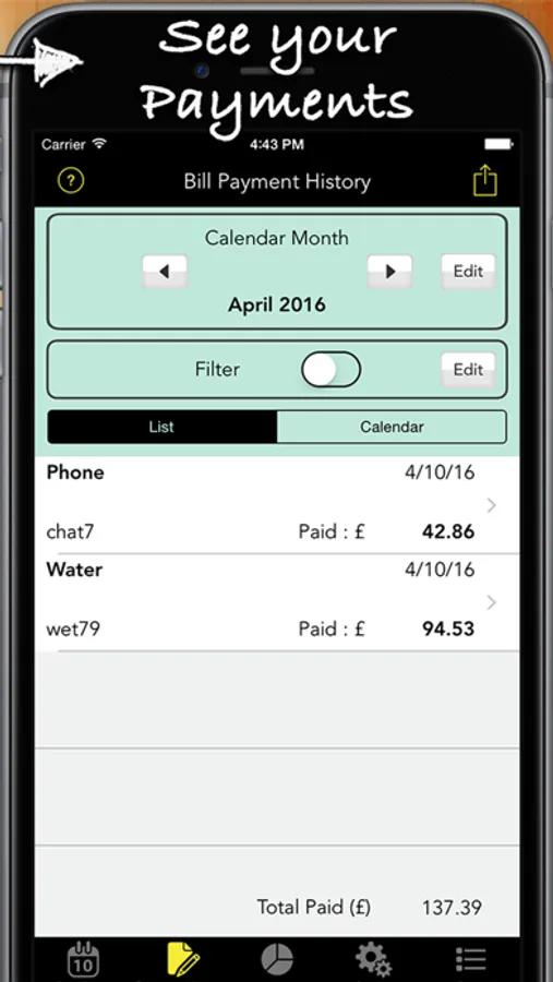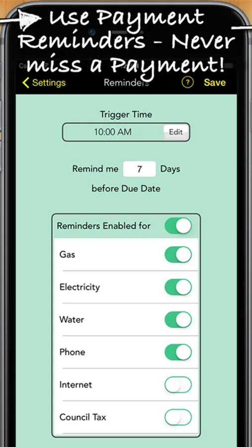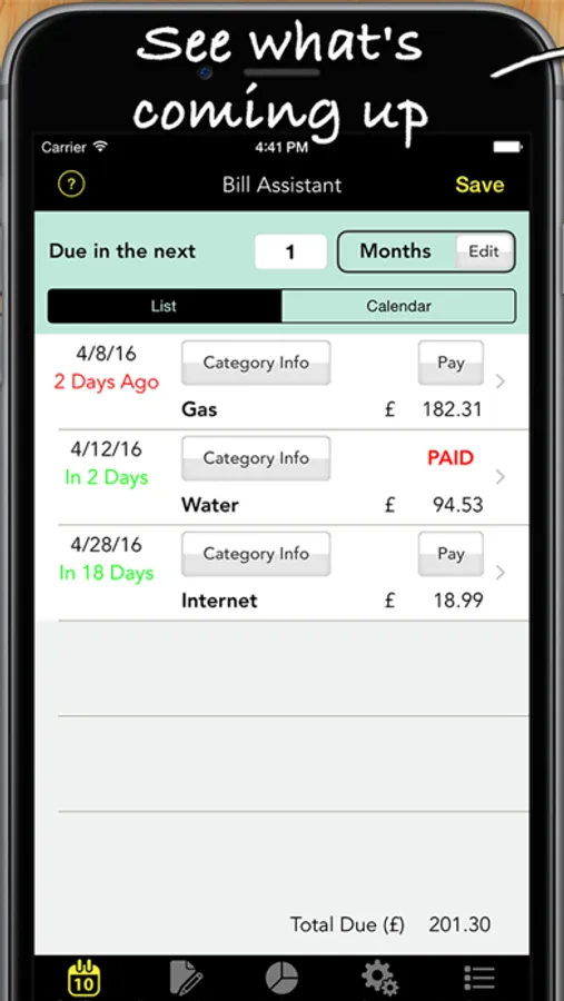 You can see which bills are due soon, see how much you are due to pay, keep a record of your payments and have the App remind you when your bills are due.