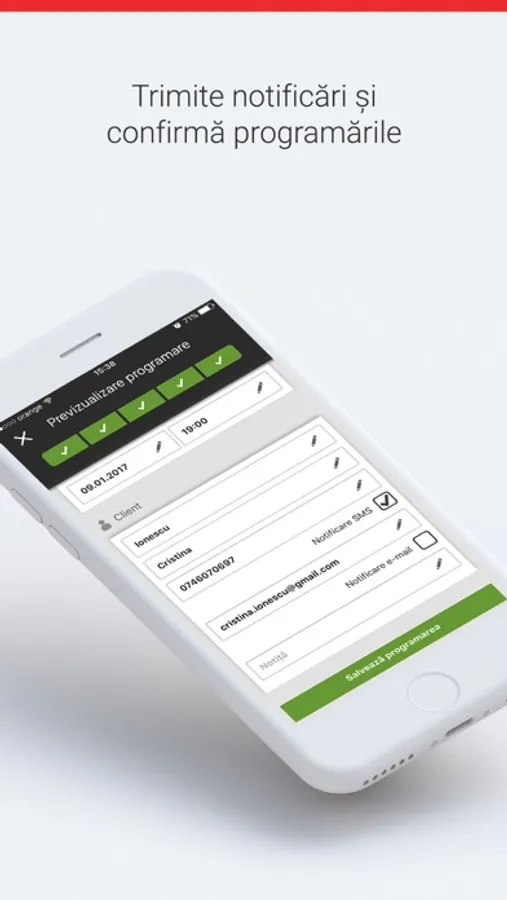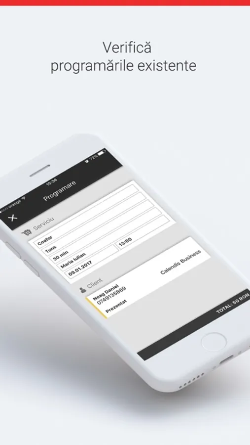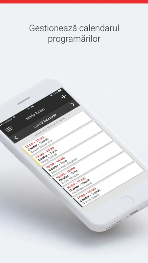 * Creezi și anulezi programări pentru clienții tăi direct de pe telefon, oriunde ai fi și la orice oră, modificările putând fi imediat văzute și de către admini