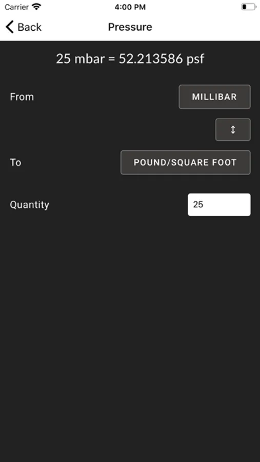 * unit conversion: calculates between pressure units millibar, bar, kilobar, hectobar, pascal, kilopascal, hectopascal, atmosphere (standard), millimeter of water (4 °C), centimeter of water (4 °C), inch of water (4 °C), foot of water (4 °C), millimeter of mercury (0 °C), foot of mercury (0 °C), torr, gram-force/square centimeter, kilogram-force/square centimeter, pound/square foot, pound/square inch, kilopond/square centimeter and kilopond/square meter