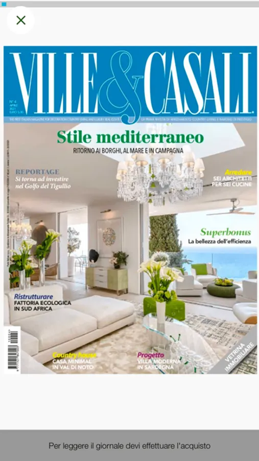 Dal 1990 Ville&Casali è la prima rivista di arredamento, di Country Living e di immobili di prestigio. Ogni mese, Ville&Casali sceglie le più belle abitazioni, in Italia e nel mondo, e le propone ai suoi lettori. Ville&Casali aiuta il lettore a realizzare il sogno di abitare in campagna, in città, al mare e in montagna con un ampio ventaglio di idee di arredo, restauro e di progettazione degli interni e del giardino. Inoltre, una vetrina di annunci immobiliari offre le diverse opportunità di immobili di prestigio in vendita in Italia e all’estero.