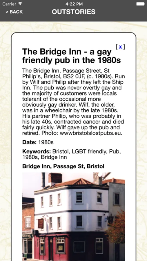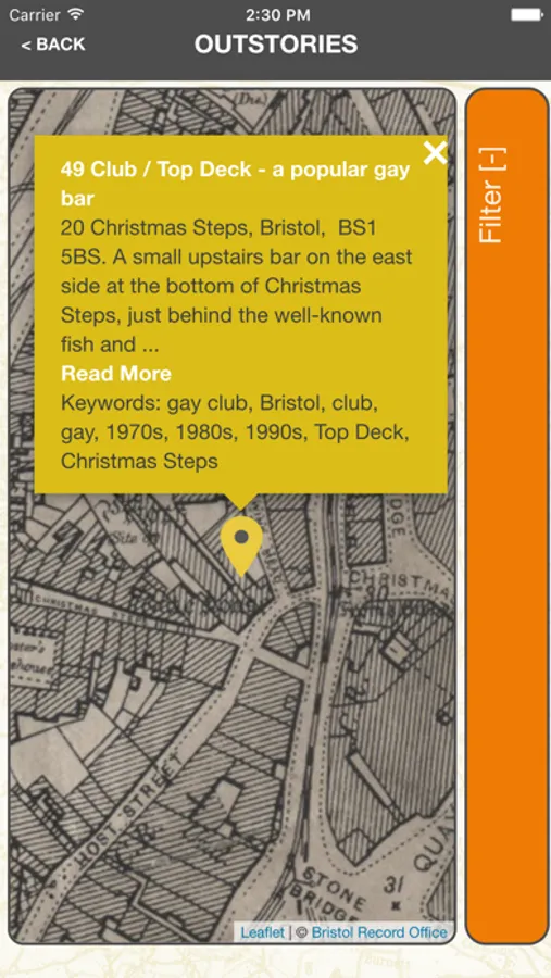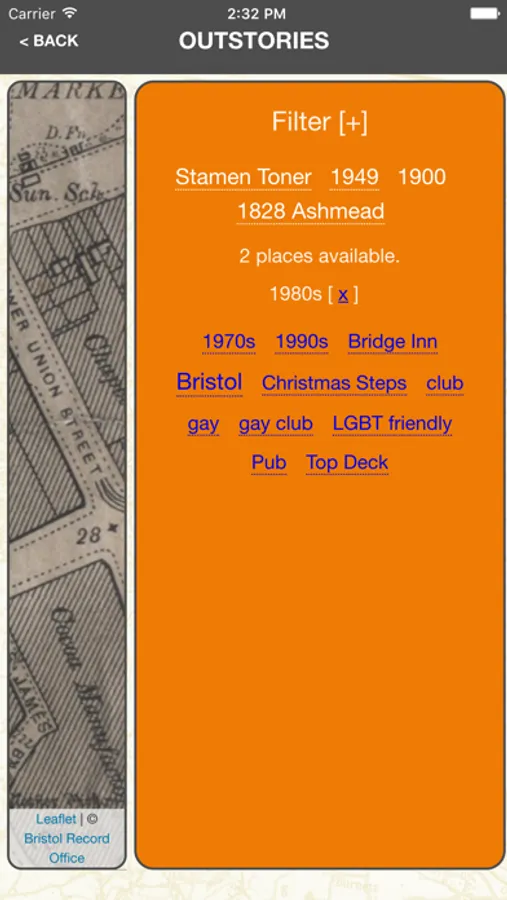 The app was created as part the AHRC-funded 'Mapping LGBT+ Bristol’ project, a collaboration between OutStories Bristol, the University of Bristol and Bristol City Council. The map content is also available on the Know Your Place site (http://maps.bristol.gov.uk/kyp/). You can contribute to the map at http://outstoriesbristol.org.uk.