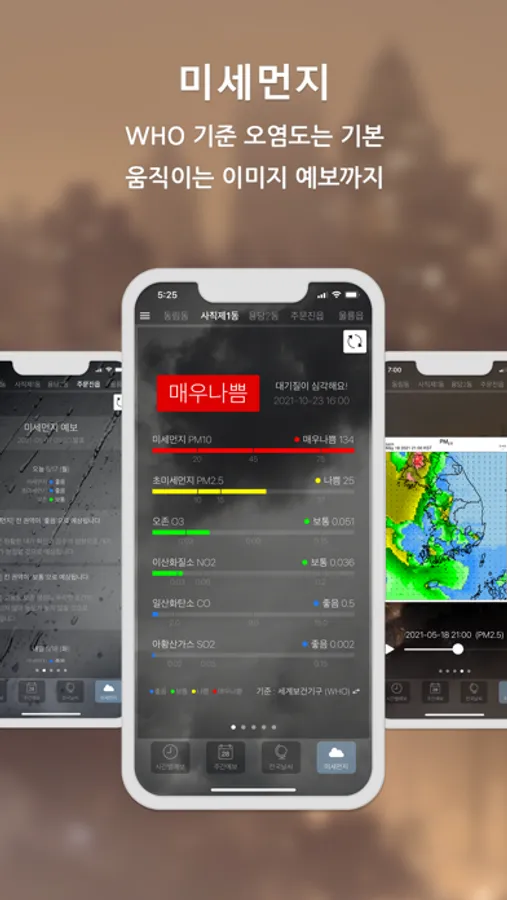 에어코리아(환경부 한국환경공단)의 데이터를 기반으로 각 지역의 미세먼지 오염도와 예보를 제공하며 WHO와 국내 기준 중 선택할 수 있습니다.