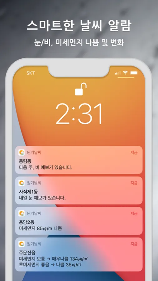 앱을 실행하지 않아도 예기치 못한 눈이나 비 소식이 있을 때 또는 대기 질이 나쁠 때 자동으로 알려줍니다. 간단한 설정 몇 가지면 사용할 수 있습니다.