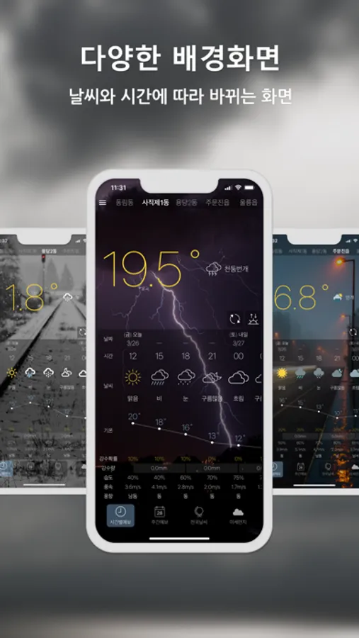 현재날씨의 변화에 맞춰 다양한 배경화면과 취향 따라 골라 쓸 수 있는 여러 날씨 아이콘이 준비되어 있습니다.
