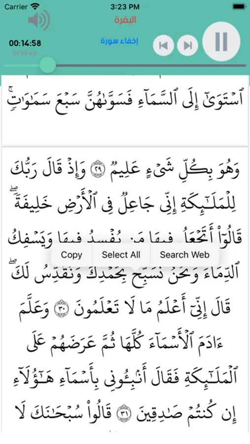 "الواجهة الامامية للتطبيق تحوي سور القرآن كاملا اضافة الي قائمة الوصول الذكية