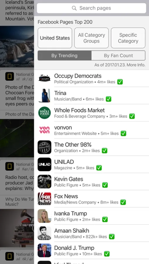 This app offers 'Facebook Page Top 200' measured by page fan count by country and category.