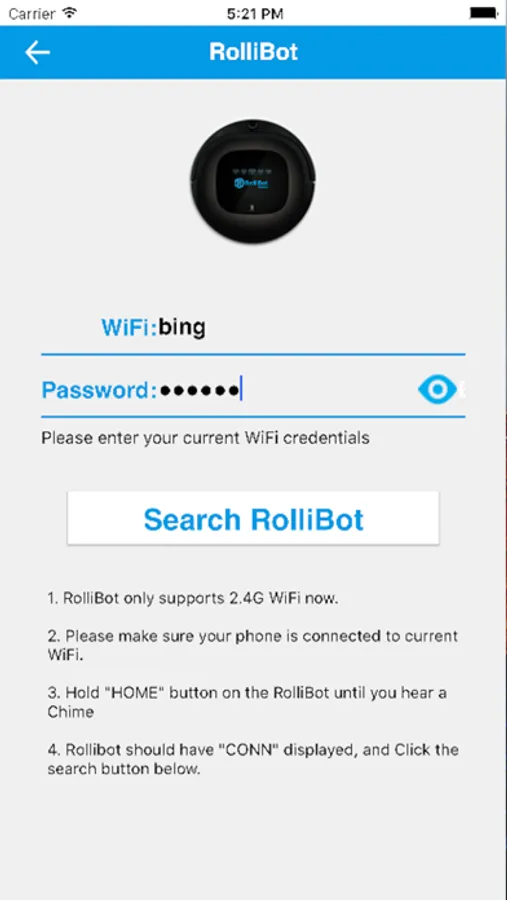 Note: RollibBot vacuum cleaner needs to access Internet by using 2.4G wifi.To control the RolliBot, your mobile phone also needs to access Internet.