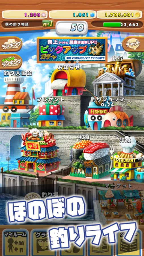 町づくりで、釣りゲームをもっと楽しく!料理やマーケットで獲得したコインで、自分のホームタウンをどんどん発展させよう!