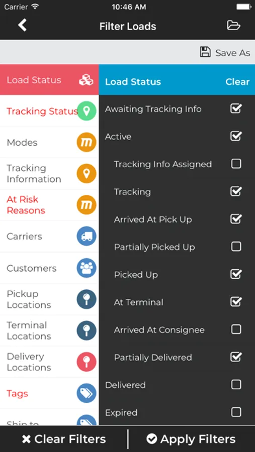 • Filter loads using the powerful search feature
