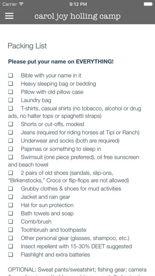 Looking for a more convenient way to access camper information? This app brings all things Carol Joy Holling Camp right to your phone or tablet! Before camp, the app will give you easy access to packing lists and directions to camp. During camp, you’ll be able to see daily photos, email your camper straight from the app, and read daily Bible studies reviews. As your camper wraps up his/her week with us, you’ll see what you should expect on Fridays (pick-up time, etc.) and the evaluation form. You’ll also have easy access to your account, the summer schedule, and our Facebook feed.