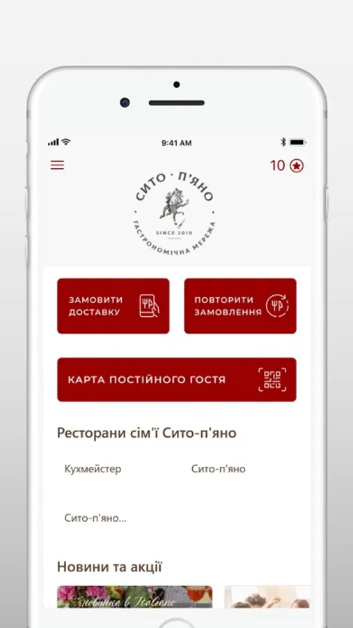 Тепер ти можеш пред'являти бонусну карту сім'ї ресторанів при кожному відвідуванні Сито-П'яно, Сито-П'яно Італіяно, Кухмейстера. При кожному замовленні в будь-якому закладі покажи нашому офіціанту додаток та отримай бали.